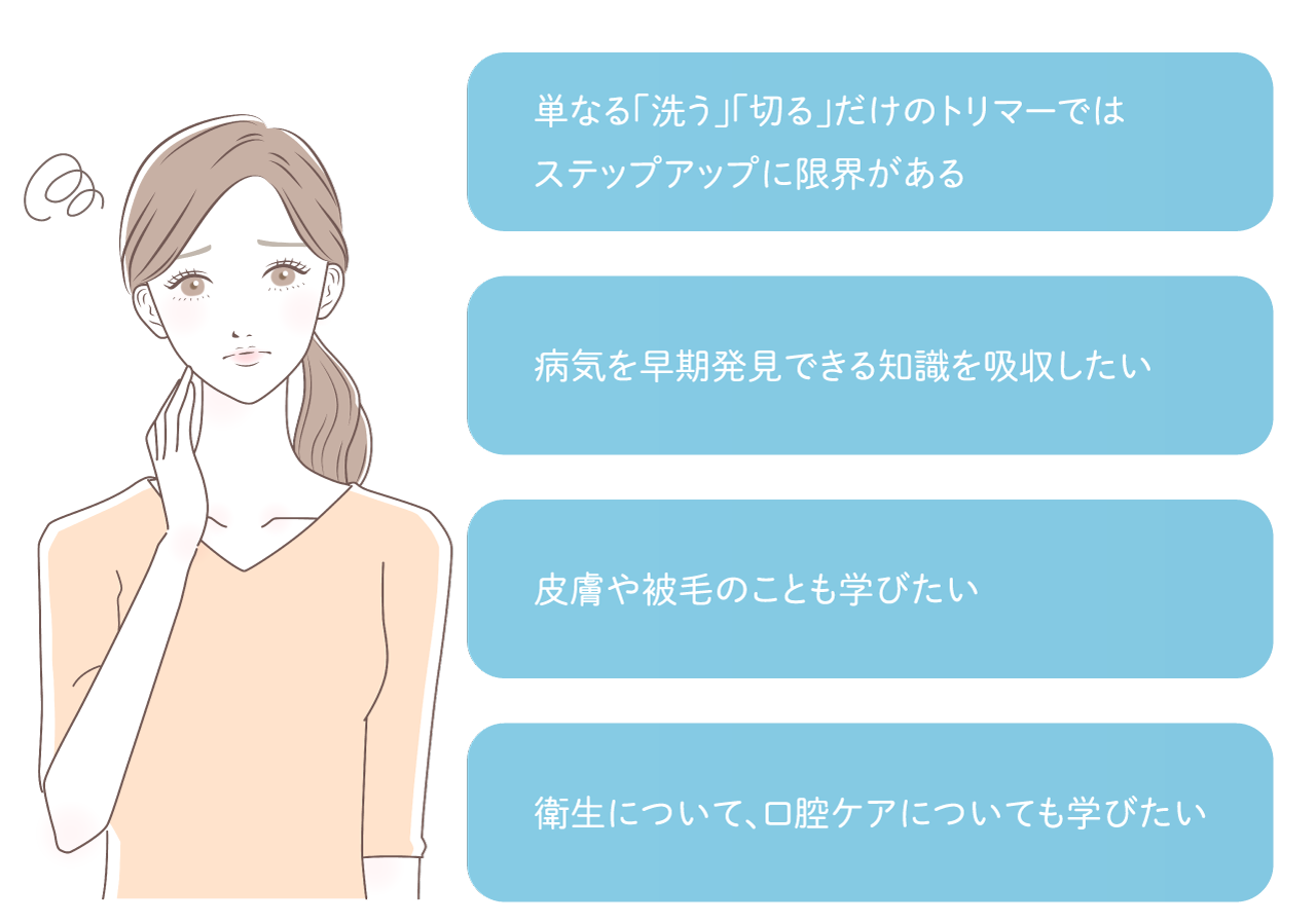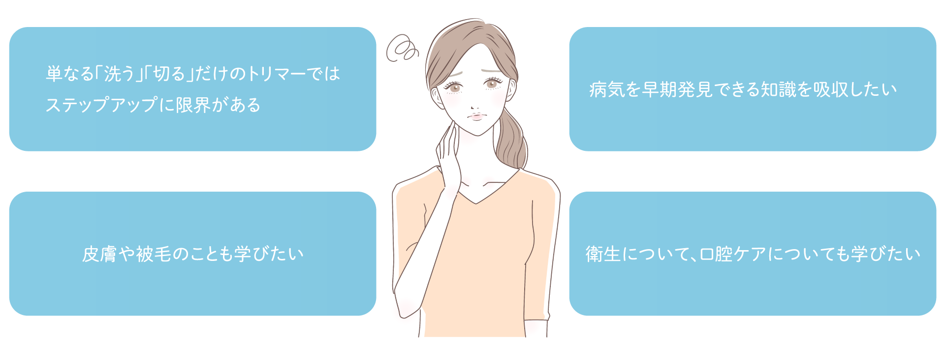 - ステップアップセミナーで、常に最新の情報にリーチするこができる=新しいケアメ ソッドを導入することで、よりペットの健康をサポートすることができる。