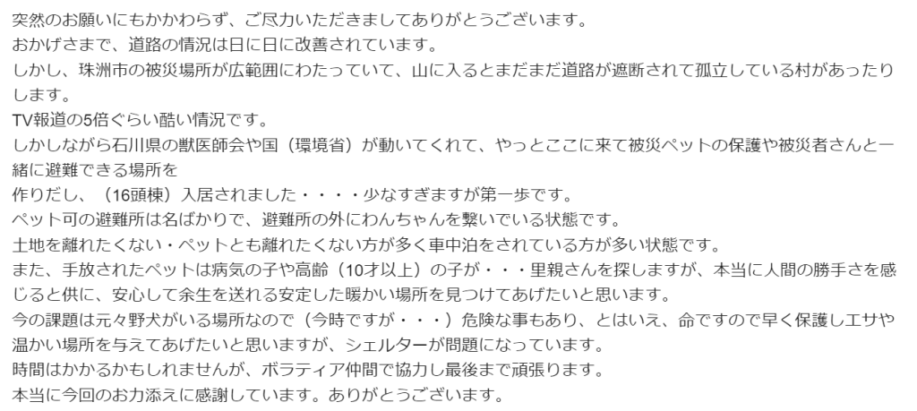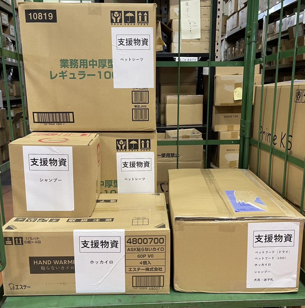 令和六年能登半島地震で被災されたみなさま、ご家族、関係のみなさまに心よりお見舞い申し上げます。 弊会には、被災地域にお住いの会員様で被災エリアにショップを構え、現在犬猫の保護活動を懸命に行っている会員さまがいらっしゃいます。 先日、メディカルトリマー協会としてフードをお送りしておりましたが、まだまだ支援物質が不足しているという状況をお聞きし、会員様に支援物資の協力のお願いをしておりました。 会員の皆さまにお力添えいただいたおかげで、昨日、犬猫の保護活動に奔放していらっしゃる会員さまに無事に発送することができました。ご協力いただき御礼申し上げます。 多くのわんちゃん・ねこちゃん、該当の会員さまに対して微力ながらもお役に立てたと思います。 お礼と共にご報告とさせていただきます。 誠にありがとうございました。