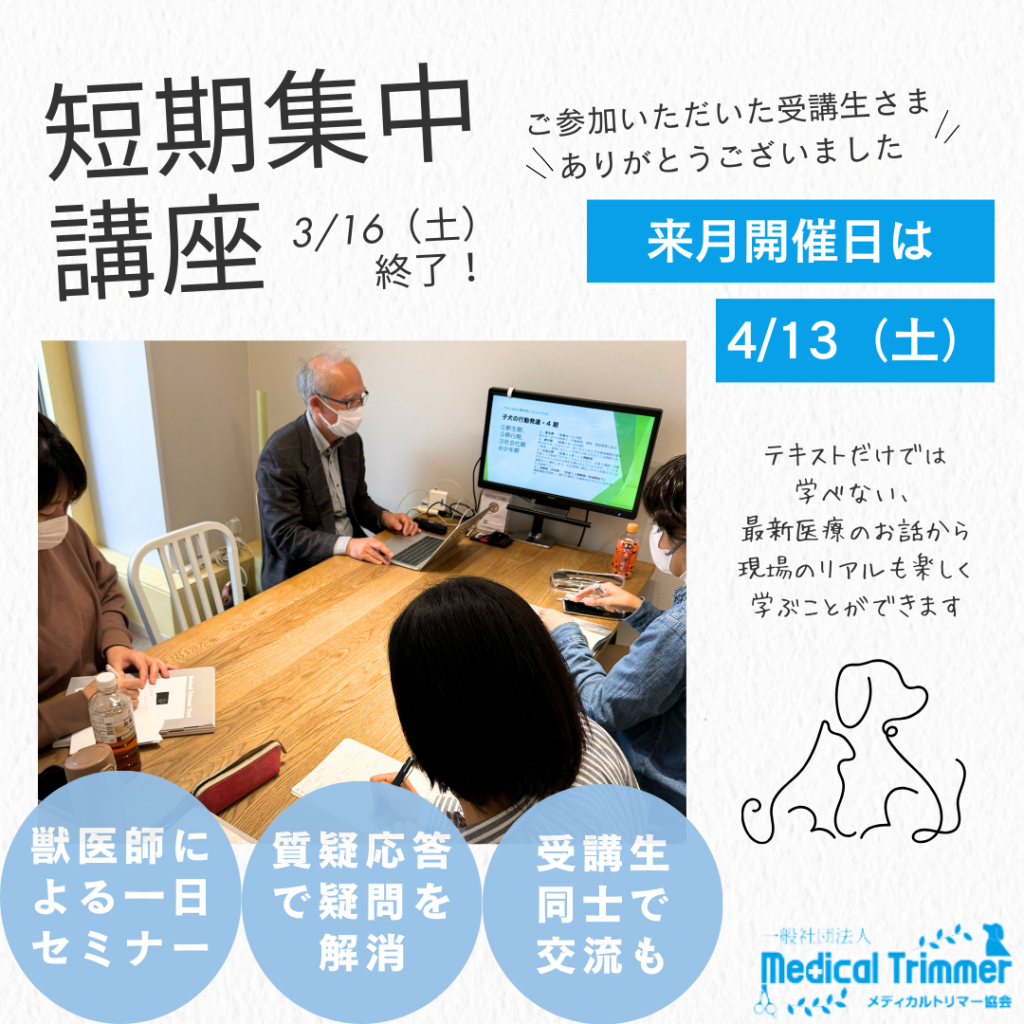 先日開催された小関隆獣医師による短期集中講座、無事終了致しました😊✨ 小関先生による親しみやすいトーク、現場の臨床から最新医療まで、 また、受講生同士だけでなく先生、弊会理事との交流まで、和気あいあいと楽しく学べました💕 ご参加いただいた受講生の皆様、ありがとうございました✨ そんな短期集中講座の次回開催日は 【日時】4/13(土) 10時〜 休憩時間、質疑応答込みで 約6時間程 【場所】東京銀座付近 【講師】獣医師 小関隆先生 となります❣️ すぐに仕事として実現させたい方、現場で活躍されている方の体験談なども知りたい方は ぜひ弊会のHPの資料請求からお問い合わせください。宜しくお願い致します🐶✨ (4月以降ですと、5月は17日(金)の開催となります。) 問い合わせ先 https://www.medical-trimmer.jp/contact/