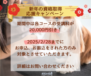 🎍新年の資格取得応援キャンペーン🎍お知らせ 年末で寒さも厳しいころとなりました。新年に新しい出発をするために学び始める年末というタイミングに合わせて、 当協会では、「資格取得応援キャンペーン」を延長することと致しました。 期間中、各コースとも20,000円引きで学習することが可能です。 飼い主として、トリマーとして、正しい知識を身に付ける、「ペットの健康ケア」の 最前線に立つためにも、是非この機会にご検討ください。 なお、2025/2/28までにお申込み、お振込のお手続きをされた方が対象となります。 詳細は弊会HPの資料請求からお問い合わせください。